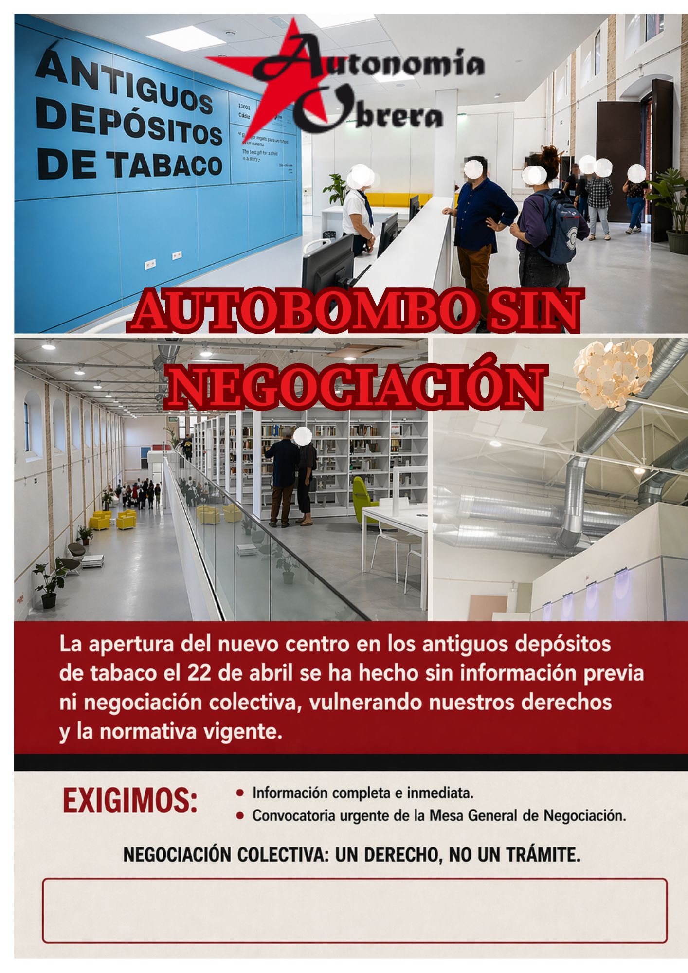 La Sección Sindical de Autonomía Obrera quiere trasladar a toda la OPINIÓN PÚBLCA lo ocurrido con la reciente apertura del nuevo centro cultural en los antiguos depósitos de tabaco de Loreto, que tuvo lugar el pasado miércoles 22 de abril de 2026. Más allá del acto en sí, lo preocupante es que este centro ha comenzado a funcionar con personal municipal sin que previamente se haya informado ni negociado nada con la representación sindical.