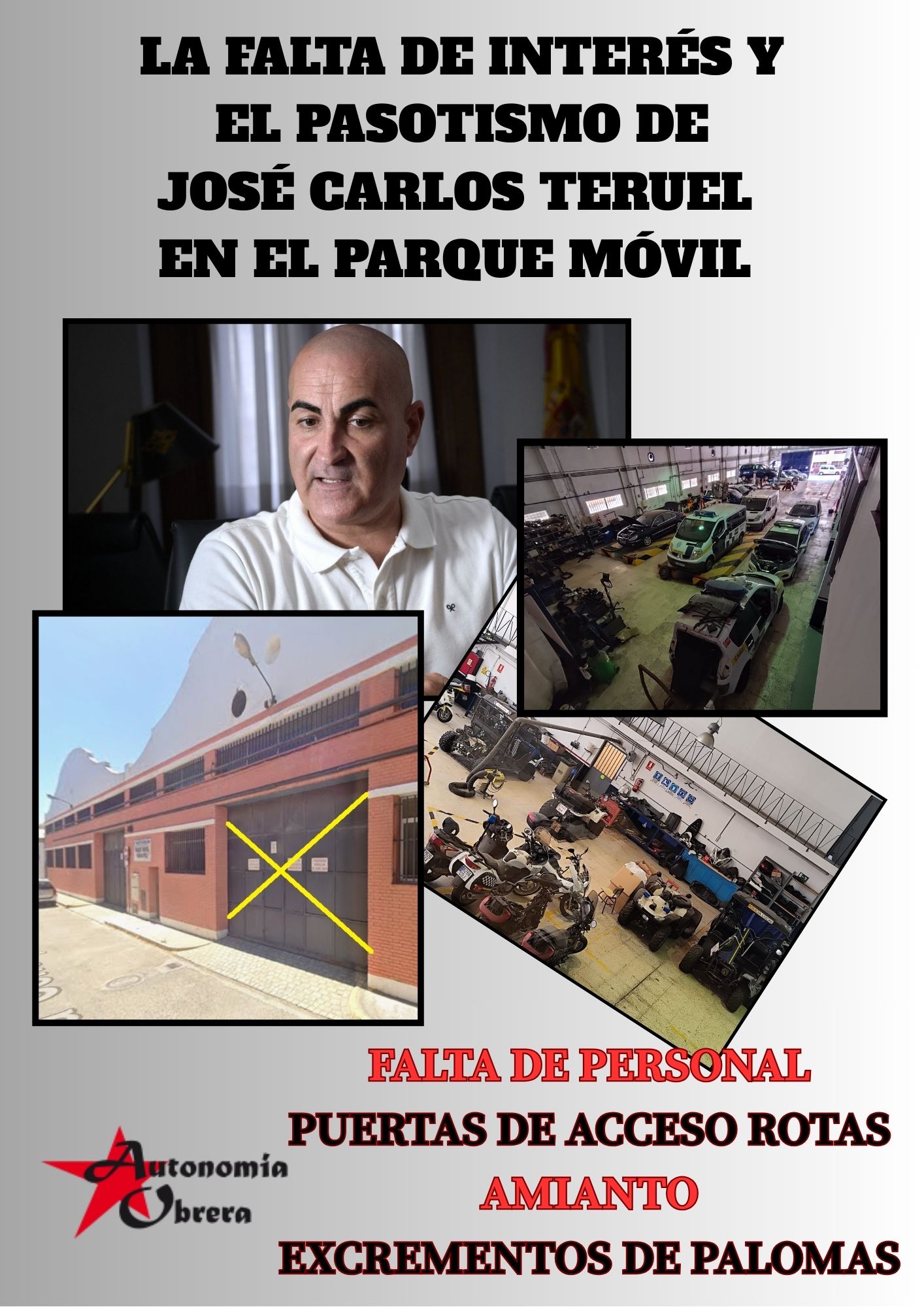 La dejadez y pasotismo del concejal José Carlos Teruel (el de la aplicación para comunicar incidencias en la ciudad) con el Parque Móvil municipal es alarmante, además de la incapacidad o la intencionalidad -lo mismo lo quiere privatizar-, para cubrir las necesidades reales de personal de dicha delegación, se suma las deficiencias de todo tipo en el centro de trabajo.