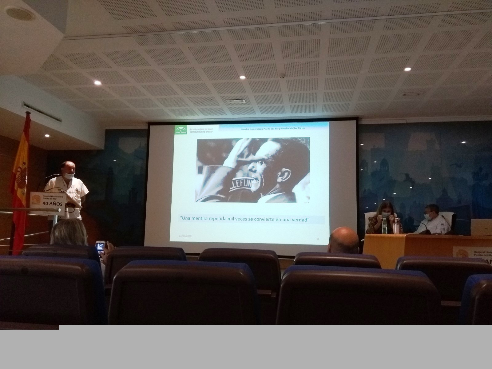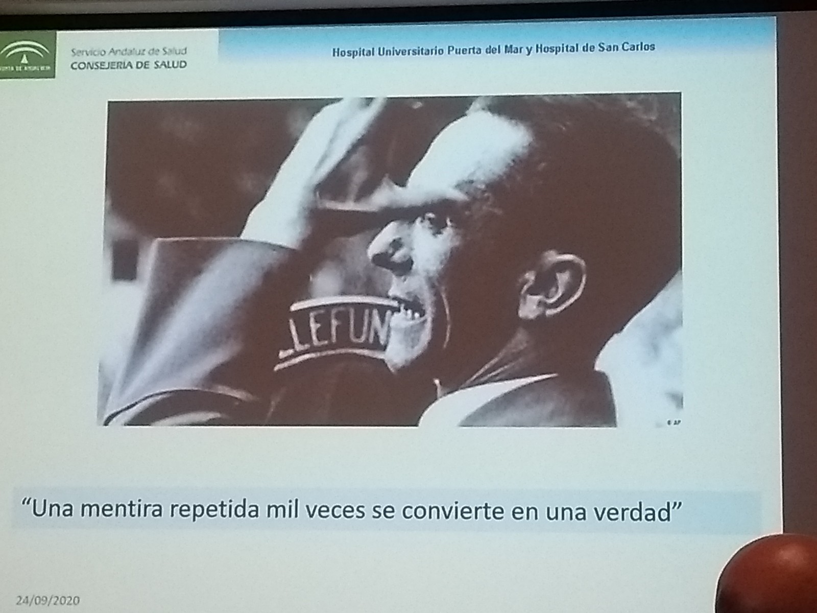 Para ello, D. Sebastián utilizó todo tipo de argumentos y comparaciones, pero la más lamentable, sin duda, fue aquella en que, para recalcar lo pernicioso y falso de la denuncia de urgencias, no tuvo otra ocurrencia que la de exponer en la pantalla del salón de actos una enorme imagen del responsable de propaganda de Hitler (y temido asesino) JOSEPH GOEBBELS con la frase, a modo de subtítulo, “UNA MENTIRA REPETIDA MIL VECES SE CONVIERTE EN UNA VERDAD” (ver fotos 1 y 2); ¿intentaba con ello comparar al personal de urgencias con el propagandista nazi, experto en convertir las falsedades en creencias ciegas?, ¿intentaba, tal vez, señalar únicamente la presunta autoría de la famosa frase?…; lo desconocemos, pero sea como fuere, lo que sí estuvo claro para muchos de los allí presentes fue que, como mínimo, llamó a todo el personal de urgencias mentirosos y, como máximo, vino a comparar abiertamente su denuncia con la repugnante propaganda nazi.