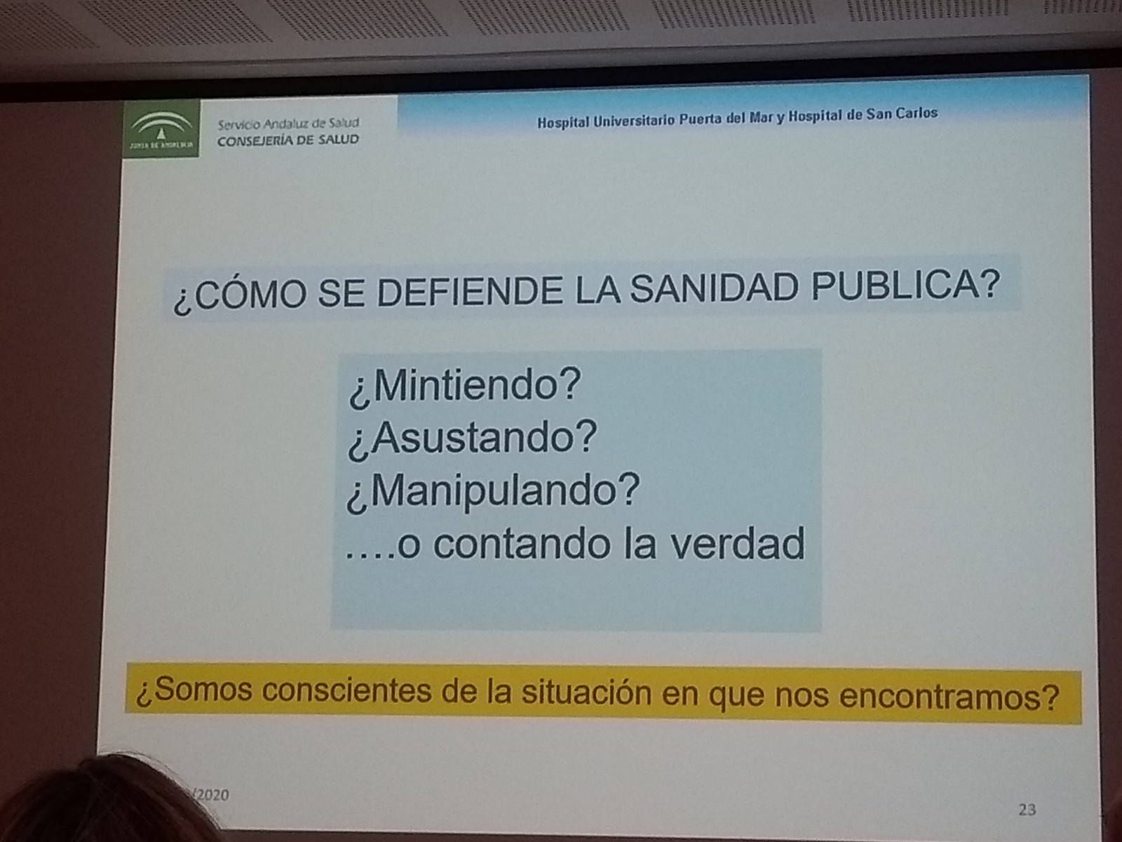 Pero la osadía del gerente, por desgracia, no terminó ahí. Henchido de prepotencia, siguió largando y largando sin parar, persistiendo una y otra vez en sus acusaciones y, después de amenazar a todo el auditorio con un rotundo “¡NO VOY A TOLERAR LAS MENTIRAS!”, llegó a manifestar que estamos en una “SITUACIÓN DE GUERRA” y comparó abiertamente el momento presente de nuestro país con lo vivido “EN LA GUERRA CIVIL” (ante la incredulidad de muchos de los que allí estaban); para colmo, y no conforme con la ya citada acusación que lanzó sobre el personal de urgencias, pasóa calificar también sus manifestaciones críticas como “ataques a la sanidad pública”, proyectando sobre la pantalla la foto número 3 que os remitimos, donde se puede leer: “¿CÓMO SE DEFIENDE LA SANIDAD PÚBLICA?, ¿MINTIENDO?, ¿ASUSTANDO?, ¿MANIPULANDO?…O CONTANDO LA VERDAD. ¿SOMOS CONSCIENTES DE LA SITUACIÓN EN QUE NOS ENCONTRAMOS?”.