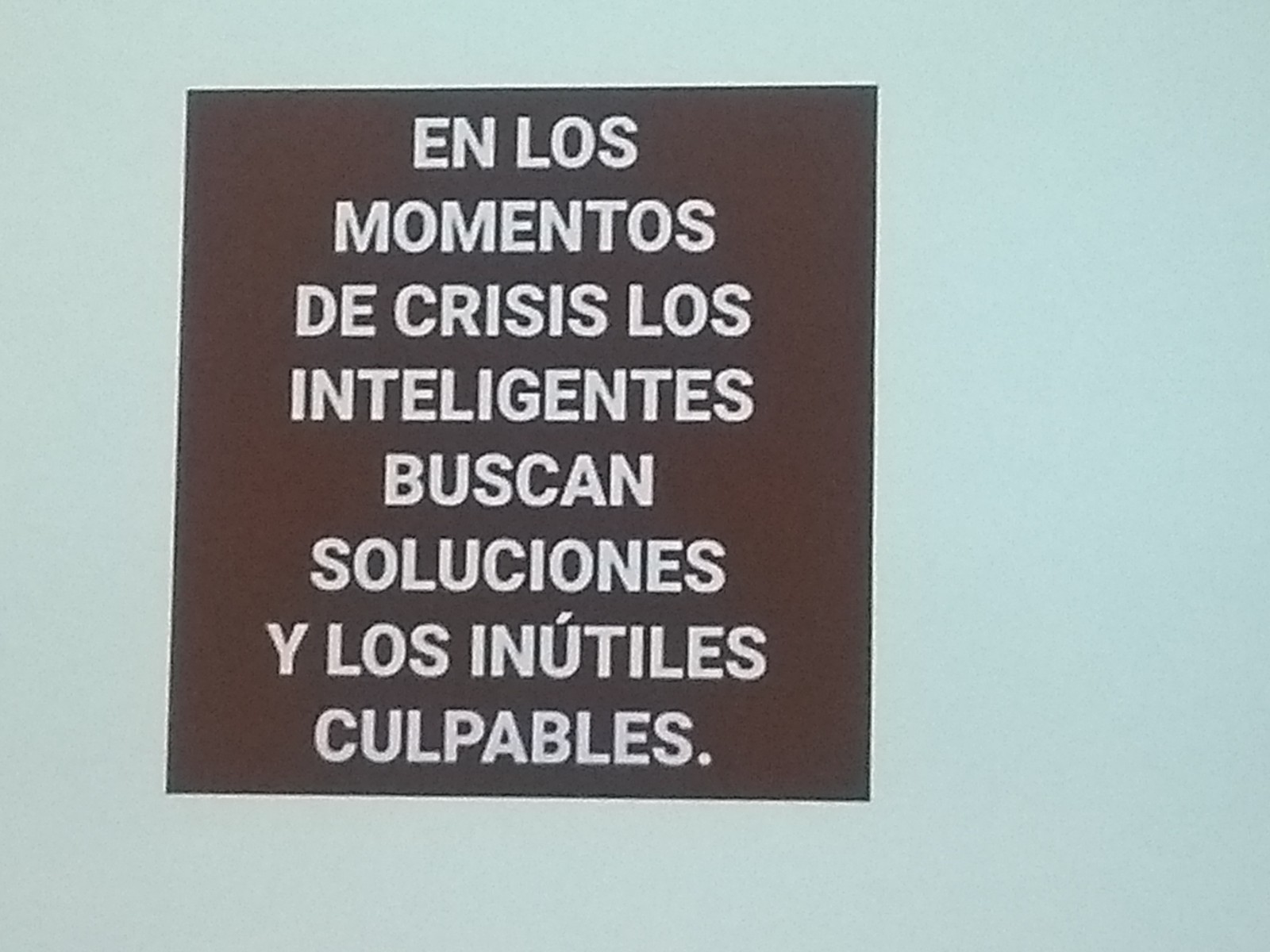 Para terminar, y como “brillante colofón” a su acusatorio mitin, debió considerar nuestro Gerente que tachar de mentirosos al personal de urgencias no era suficientemente contundente y que, ya que estábamos en una “situación de guerra” (en la que todo suele valer), nada impedía ampliar la acusación a todos cuantos se atreven a criticar su gestión y la del SAS en esta pandemia, por lo que no tuvo el menor empacho en finalizar el acto proyectando la imagen que os adjuntamos como doc. 4 y donde puede leerse el siguiente texto: “EN LOS MOMENTOS DE CRISIS LOS INTELIGENTES BUSCAN SOLUCIONES Y LOS INUTILES CULPABLES”